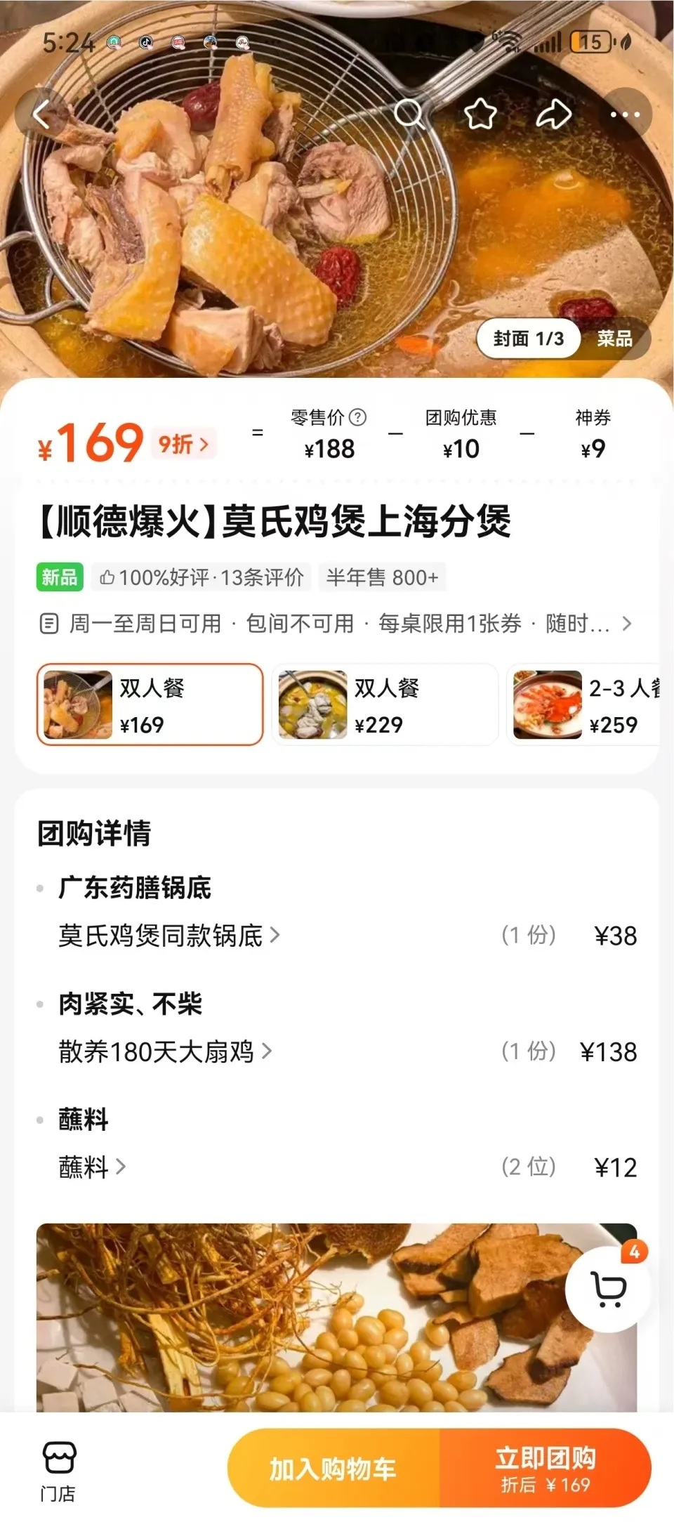 “在定价方面,同款锅底售价38元,同时推出180天与220天的鸡供选择,满足不同需求。”在消费平台上,门店推出“莫氏鸡煲上海分煲”套餐,包含锅底、散养180天大扇鸡、2份蘸料,定价169元。