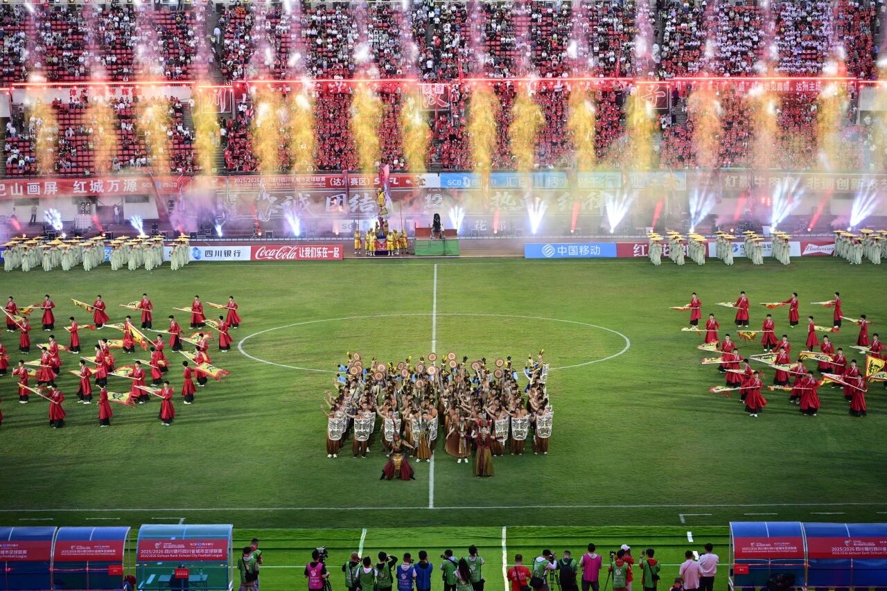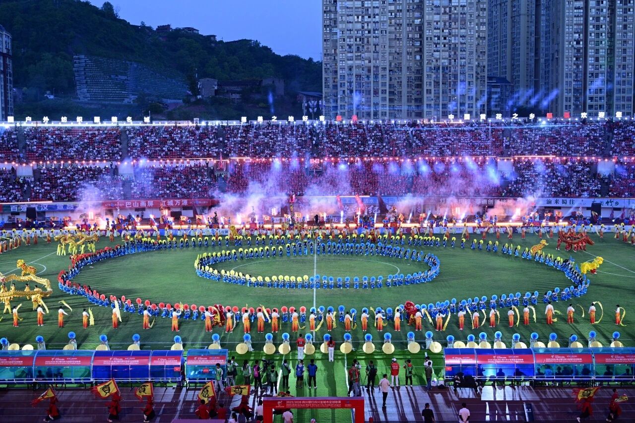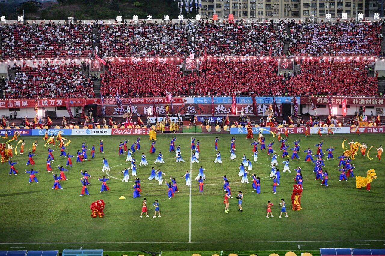 4月18日晚,达州市体育中心,2025/2026四川银行四川省城市足球联赛(川超)决赛阶段第六轮激情上演。达州川汉子队主场迎战自贡灯城燊龙队,最终以4:2的比分取得胜利。这场比赛的精彩远不止于绿茵场上的比分,一场融合了千年巴賨文化与现代足球激情的视听盛宴,让达州的夜空格外璀璨。